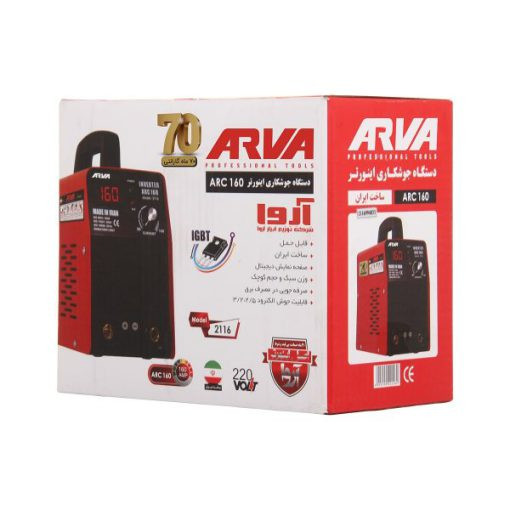 اینورتر جوشکاری ۱۶۰ آمپر آروا مدل ۲۱۱۶، یکی از دستگاه جوش های آروا است؛ که در مصارف خانگی مورد استفاده قرار میگیرد. به علت وزن و حجم مناسب (۴ کیلوگرم و با ابعاد ۲۴۰×۱۲۰×۲۷۰ میلیمتر) و اتصال بند دوشی حمل و نقل آسان شده است. همراه این دستگاه جوش متعلقات با کیفیتی نظیر انبر جوش و انبر اتصال وجود دارد.