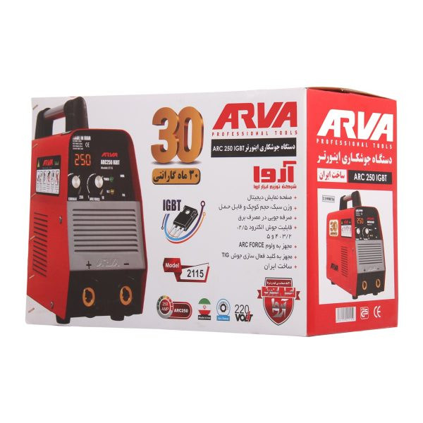 دستگاه جوش آروا ۲۵۰ مدل ۲۱۱۵، یکی از ابزارهای آهنگری و جوشکاری است که دارای مصارف صنعتی است. این دستگاه به علت وزن و حجم مناسب (۹کیلوگرم و با ابعاد ۴۹۵×۱۵۵×۲۴۰ mm) باعث حمل و نقل آسان این دستگاه شده است.برای کارکرد مناسب دستگاه، نیازمند ولتاژ خروجی ثابت هستیم. اما با وجود جریان متناوب AC که در مدار های برق شهری وجود دارد؛ ولتاژ و جهت جریان تغییر می کند. دستگاه جوش اینورتر ۲۵۰ آروا، دستگاهی یکسوکننده است که با تبدیل جریان متناوب به جریان مستقیم، این ولتاژ ثابت را تامین می کند.