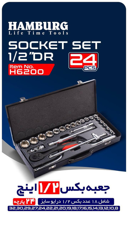 جعبه بکس 24 پارچه هامبورگ شامل 18 عدد بکس 1/2 اینچ 8/10/12/13/14/15/16/17/18/19/20/21/22/24/27/29/30/32